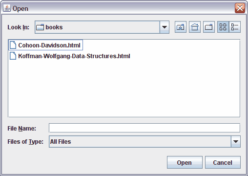 r = fc.showOpenDialog(owner); // button labeled "Open" r = fc.showSaveDialog(owner); // button labeled "Save" r = fc.showDialog(owner, title);
