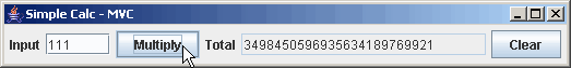 Here the same calculator is organized according the the Model-View-Controller (MVC)pattern. The idea is to separate the user interface (the Presentation in the previous example) into a View (creates the display, calling the Model as necessary to get information), and Controller (responds to user requests, interacting with both the View and Controller as necessary). The literature on MVC leaves room for a number of variations, but they all follow this basic idea. This model is simple and can be used with simple method calls. If there are more complex interactions (eg, the Model is asynchronously updated), an Observer pattern (listeners) may be required.