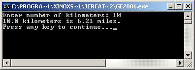 // File : examples/console/KmToMilesConsole.java // Description: Converts kilometers to miles. // Illustrates: Console IO for read-compute-write program, named constants. // Author : Fred Swartz - 2007-01-18 - Placed in public domain. import java.util.*; // Package containing Scanner public class KmToMilesConsole { //==================================================================== constants static final double MILES_PER_KILOMETER = 0.621; //Note 1 //========================================================================= main public static void main(String[] args) { Scanner in = new Scanner(System.in); //Note 2 //... Input System.out.print("Enter number of kilometers: "); double kilometers = in.nextDouble(); //... Computation double miles = kilometers * MILES_PER_KILOMETER; //... Output System.out.println(kilometers + " kilometers is " + miles + " miles."); } } |