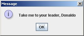 JOptionPane.showMessageDialog(null, "Take me to your leader, " + name);