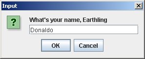 name = JOptionPane.showInputDialog(null, "What's your name, Earthling");