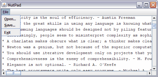 This very simple editor illustrates several things: the use of menus, JFileChooser, and Actions.