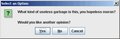 } while (JOptionPane.showConfirmDialog(null, display) == JOptionPane.YES_OPTION);