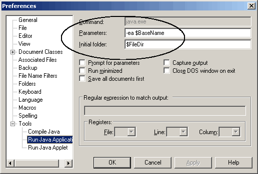 The Parameter field should have$BaseName(with blanks around it). You can skip the "-ea", which stands for "enable assertions". The Initial Folder should have$FileDirin it.