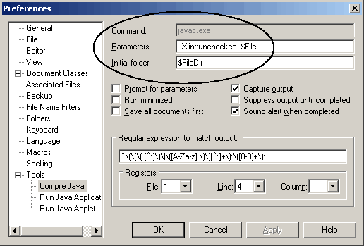 Configure > Preferences > Tools > Compile Java > Parametersfield. You only need $File in it. Reinstalling TextPad might clear it up. When I reinstall it I get the following.-Xlint:unchecked $File