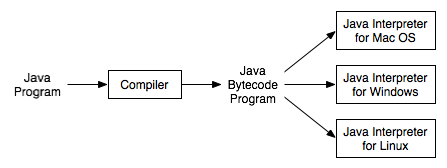 Of course, a different Jave bytecode interpreter is needed for each type of computer, but once a computer has a Java bytecode interpreter, it can run any Java bytecode program. And the same Java bytecode program can be run on any computer that has such an interpreter. This is one of the essential features of Java: the same compiled program can be run on many different types of computers.
